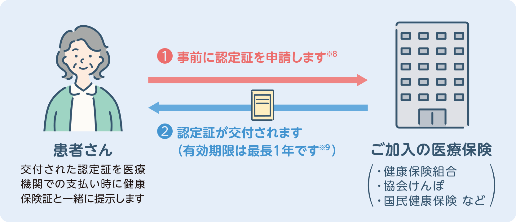 事前に限度額適用認定証(以降、認定証)を申請し、窓口での支払い時に交付された認定証と健康保険証を提示することで※6、ひと月の窓口での支払いを自己負担限度額までにすることができます※7。