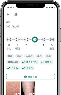 日々の症状を部位別に記録したり、服薬の確認ができます。症状記録では、痛みの強さや、付随するほかの症状を入力したり、写真を撮って記録できます。診察時に思い出して説明するのが難しい内容でも、アプリ内の記録を見返しながら話すことで、医師への報告や相談がしやすくなります。
