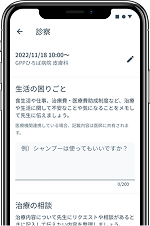生活での困りごと・治療の相談、そのほか気が付いたことを思いついたときに忘れないように、簡単なメモとして書き留めておくことができます。診察時にそれを見ながら先生と話すことで説明もしやすくなります。